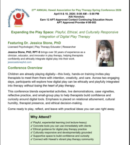 This program is offered by the Hawaii Association for Play Therapy (HAPT), an Association for Play Therapy (APT) Approved Provider. HAPT maintains responsibility for the program and its content. Participants who attend the full conference will receive 12 APT-Approved Contact Continuing Education Hours.